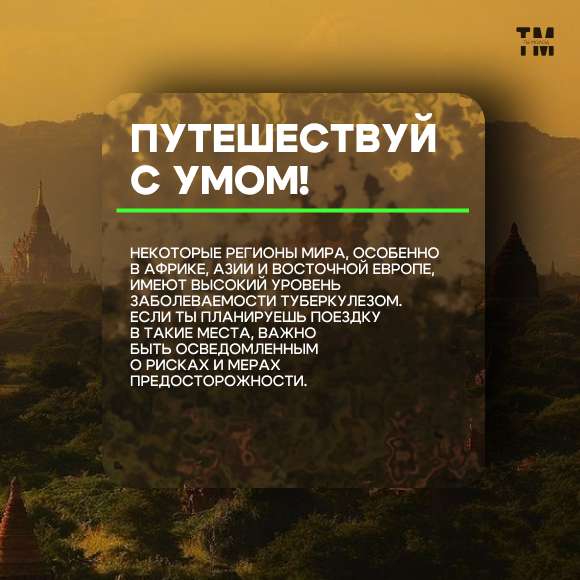 Некоторые регионы мира, особенно в Африке, Азии и Восточной Европе, имеют высокий уровень заболеваемости туберкулезом. Если ты планируешь поездку в такие места, важно быть осведомленным о рисках и мерах предосторожности.