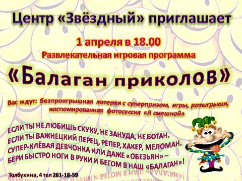 1 апреля в 18.00 в Центре «Звёздный» пройдет развлекательно-игровая программа «Балаган приколов».