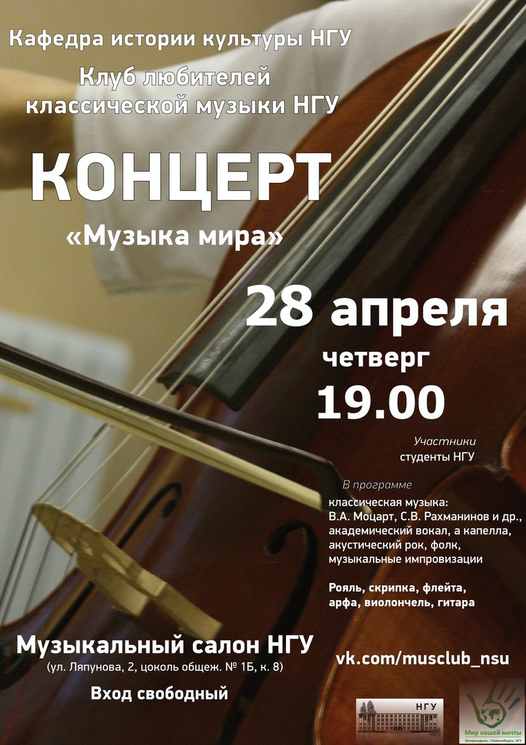 Большой концерт «Музыка мира» от клуба любителей классической музыки НГУ прозвучит в четверг, 28 апреля, в Музыкальном салоне НГУ в рамках фестиваля «Интернеделя 2016».