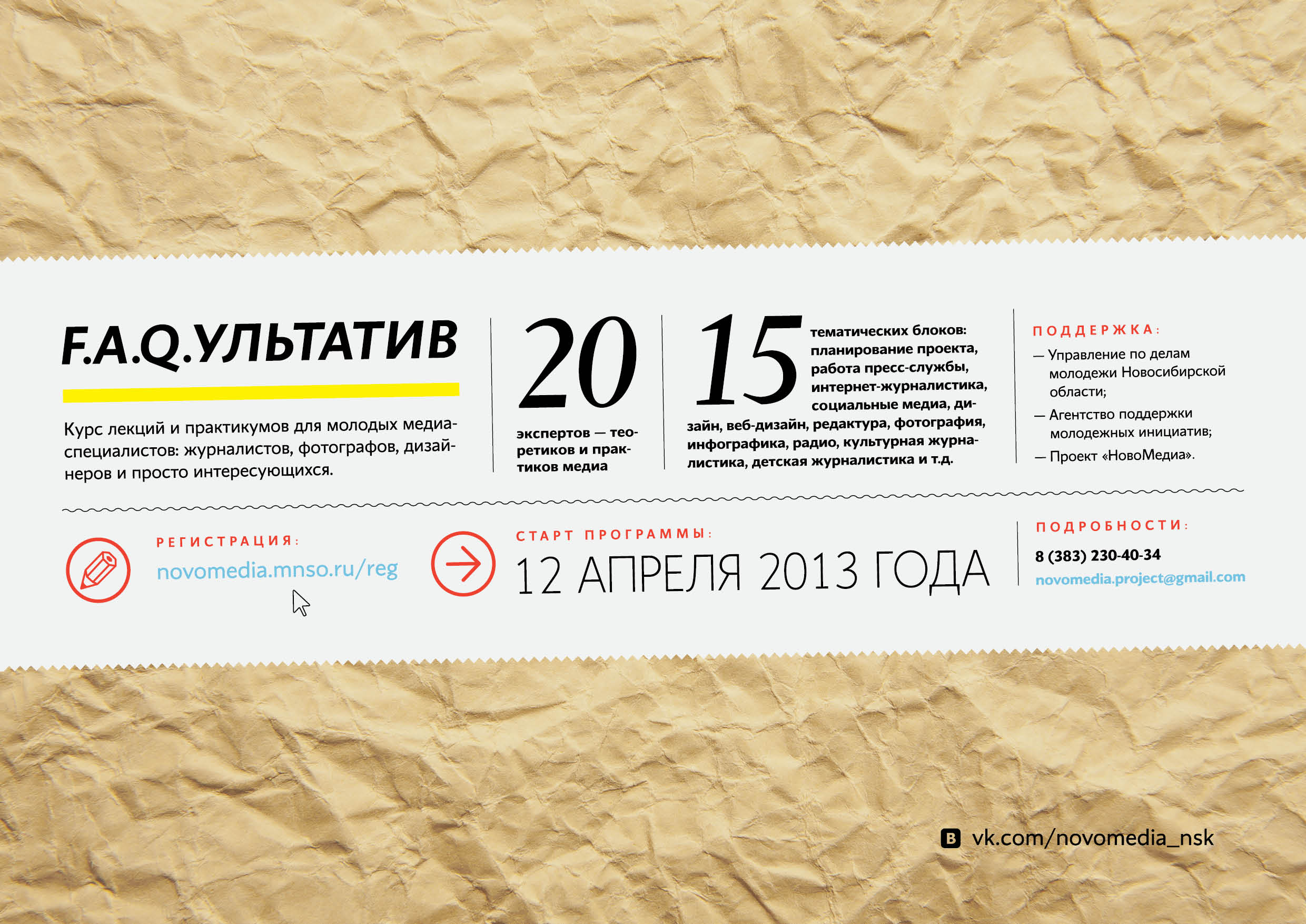 12 апреля 2013 года стартует масштабная образовательная программа «F.A.Q.’ультатив» для молодых медиаспециалистов: журналистов, фотографов, PR-щиков, дизайнеров и просто интересующихся. Организатором программы является ГБУ НСО «Агентство поддержки молодежных инициатив», проект «НовоМедиа».