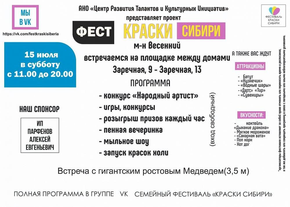 - 20-00 Закрытие Фестиваля «Краски Сибири».