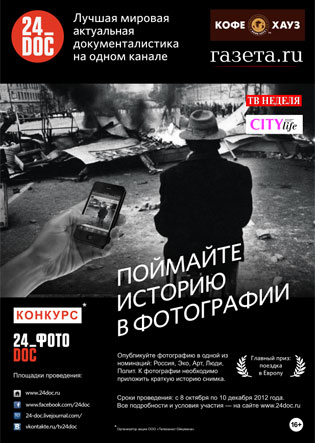 Для участия в Конкурсе претенденту необходимо разместить фотографию по одной из тем – Россия, Арт, Эко, Люди, Полит - сопроводив фотографию ее описанием - историей, связанной с этим снимком. Размещение фотографий возможно на следующих площадках: www.24doc.ru, http://www.facebook.com/24doc , http://vk.com/tv24doc , http://24-doc.livejournal.com .Претендент также может опубликовать фото в сети Instagram, сопроводив описанием и пометками @24doc и #24doc, или прислать фотографию с описанием на электронный адрес pr@nks-media.ru c пометкой «Конкурс «ФОТО_DOC».