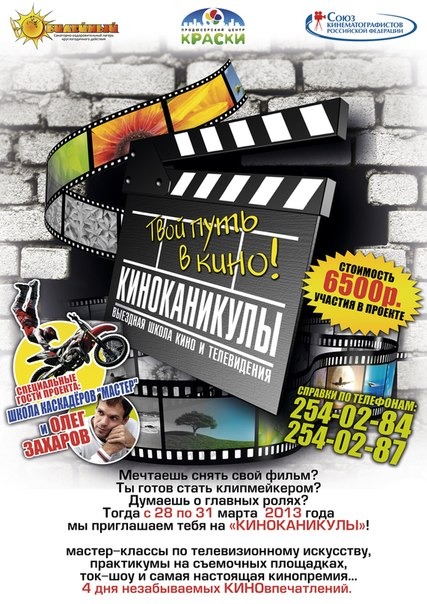 С 28 по 31 марта 2013 года Продюсерский Центр «Краски» совместно с детским оздоровительным лагерем «Юбилейный» (г.Бердск) впервые в Новосибирске реализуют выездную школу кино и телевидения «КИНОКАНИКУЛЫ». К участию в проекте приглашаются школьники в возрасте от 7 до 17 лет.