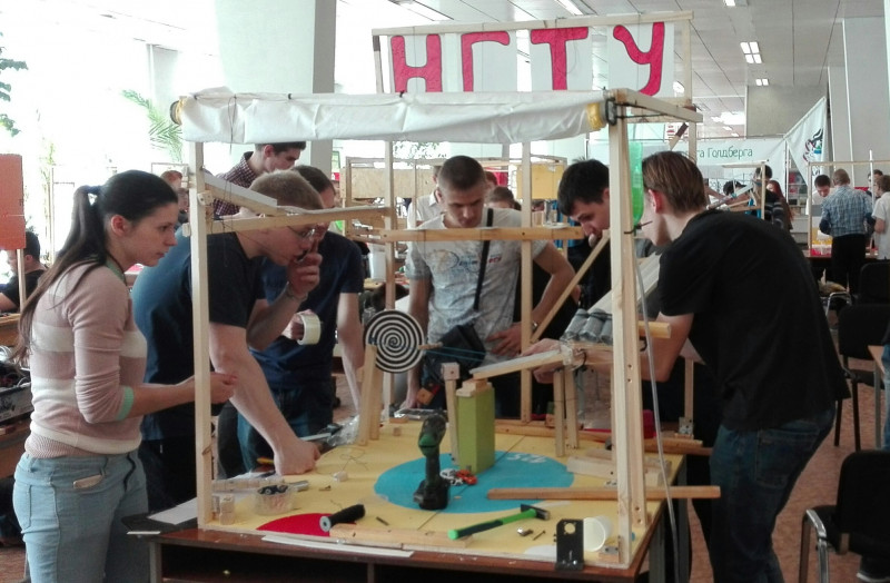 Студенты факультета мехатроники и автоматизации НГТУ на соревновании «Сибирская Лига Голдберга—2018» проявили инженерную изобретательность и при поддержке СБИ «Гараж» построили лучшую машину Голдберга .