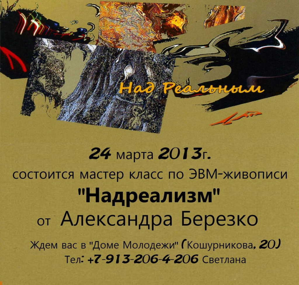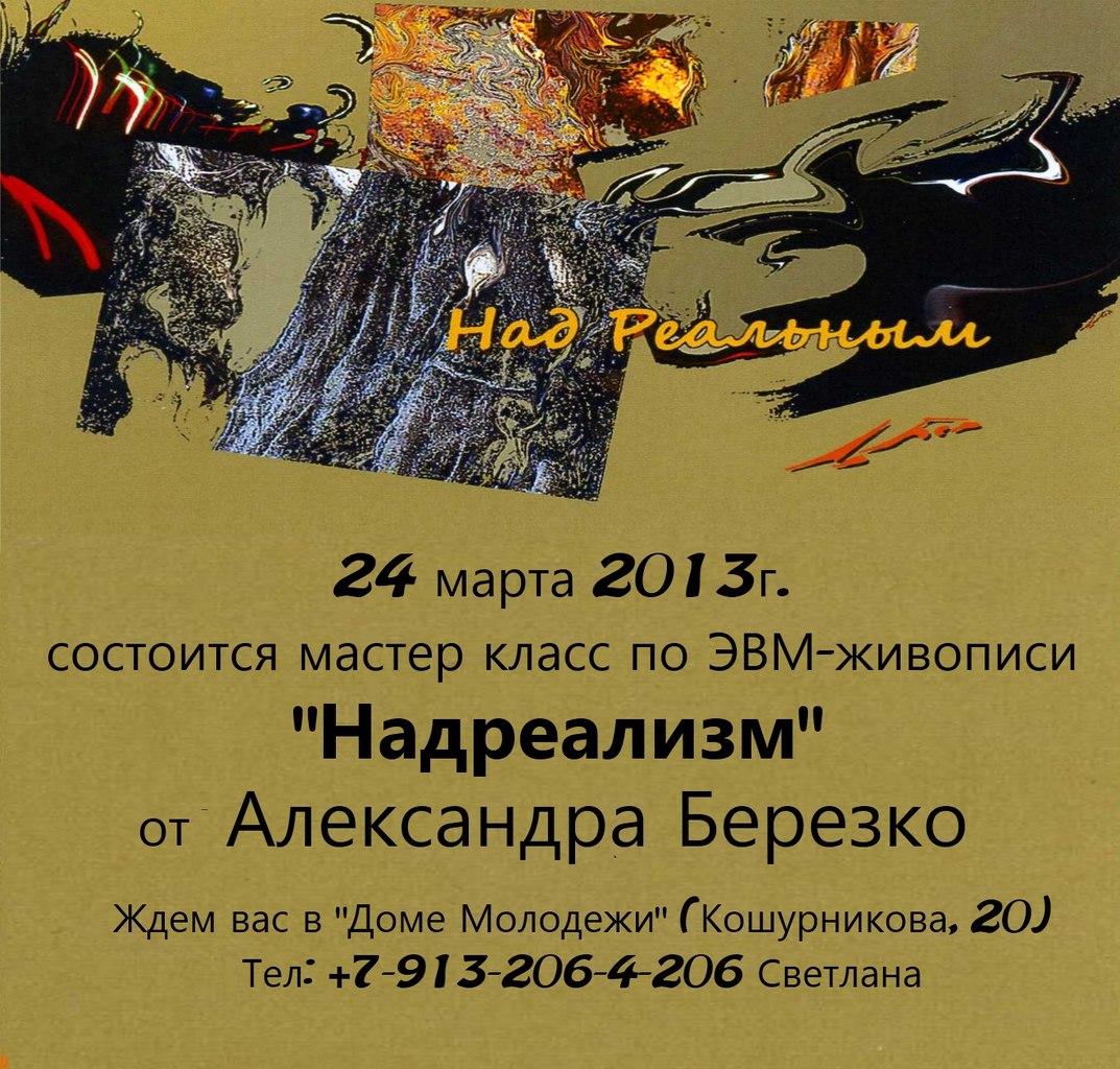 24 марта в 17.00 в Центре «Звёздный», СП «Дом молодежи» состоится мастер-класс по ЭВМ-живописи «Надреализм» от Александра Березко.