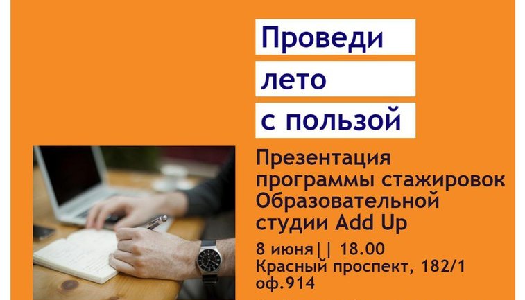 8 июня, в четверг, в деловом центре «Европа» (Красный проспект, 182/1, офис 914) пройдёт презентация программы стажировок образовательной студии Add Up.