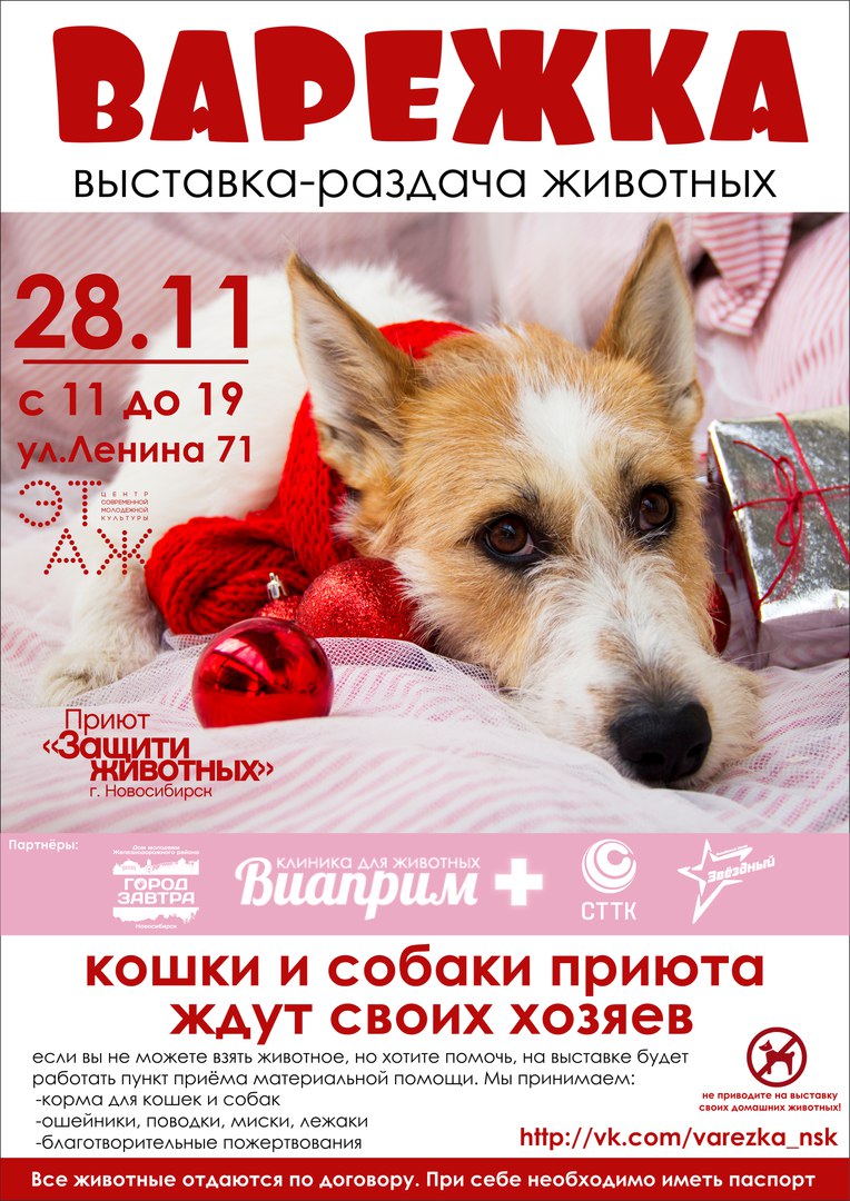 28 ноября в центре современной молодежной культуры «Этаж» (ул. Ленина, 71) пройдет очередная благотворительная акция-раздача бездомных животных «Варежка».
