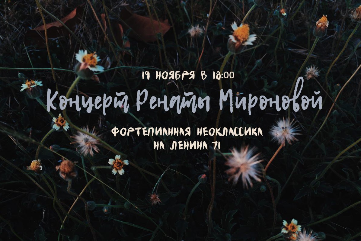 19 ноября новосибирская композитор и пианистка Рената Миронова сыграет сольную программу в культурном центре «Этаж» (ул. Ленина, 71). Каждая её композиция - оживлённые фортепиано личные чувства и мысли, которыми Рената поделится с вами.