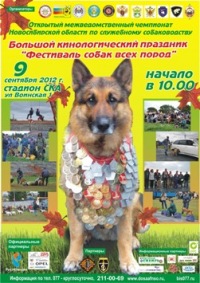 09 сентября 2012 года в Новосибирске на стадионе Спортивного Клуба Армии (ул. Воинская,1) пройдет Большой кинологический праздник «Фестиваль собак всех пород», посвященный 75-летию Новосибирской области. В рамках Фестиваля состоится Открытый Межведомственный чемпионат Новосибирской области по служебному собаководству. Мероприятие такого масштаба единственное в России, в нашем городе стало традиционным и собирает огромное количество участников (любителей и профессионалов), гостей и зрителей.