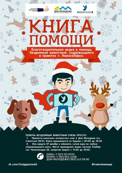 Волонтерский корпус НСО совместно с Домом молодежи 27 января в третий раз проведет благотворительную акцию «Книга Помощи», направленную на оказание помощи приютам для бездомных животных города. Каждый желающий может принести корм для собак или кошек и обменять его на любую понравившуюся книгу, предложенную на акции.