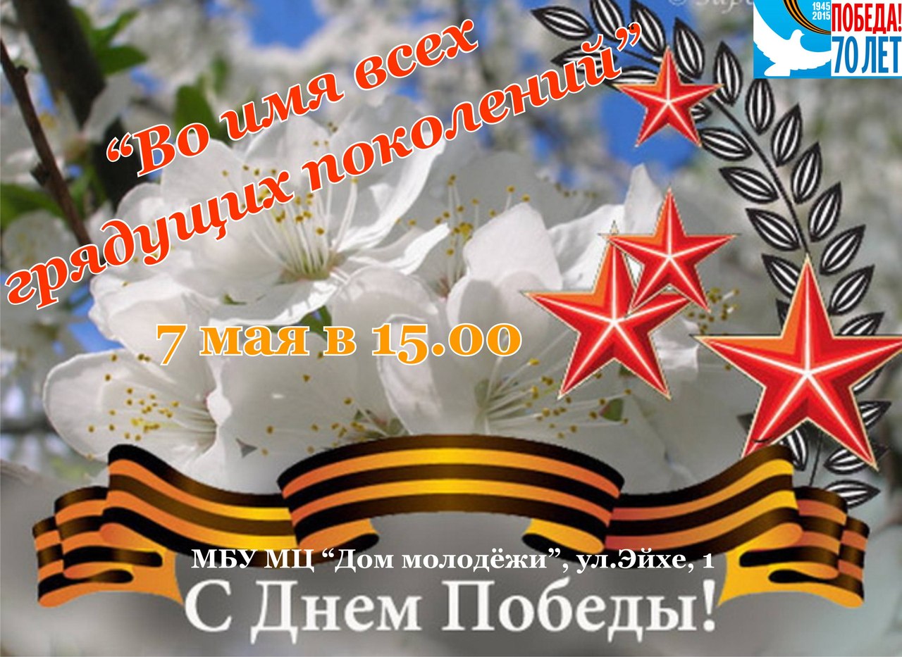7 мая в большом зале "Дома молодежи" состоится праздничный концерт "Во имя всех грядущих поколений". Главной целью праздника будет чествование ветеранов.