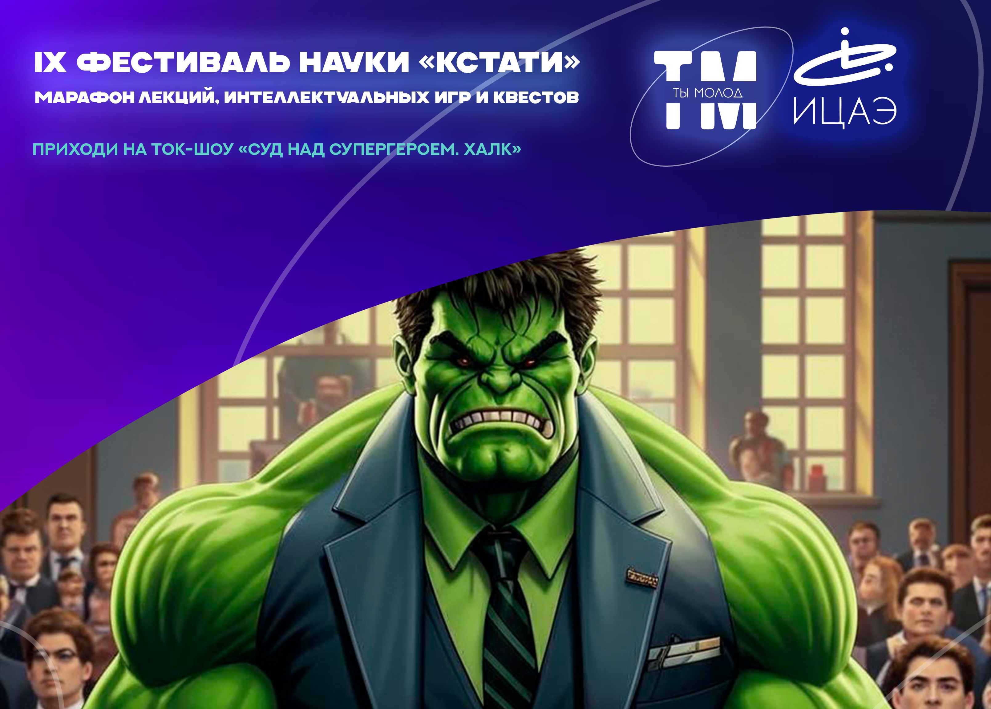 Станешь лишь ты свидетелем суда над супергероем? Приходи на ток-шоу «Суд над супергероем. Халк» IX фестиваля науки «Кстати», и узнаешь, как ученые распорядятся судьбой известного персонажа!