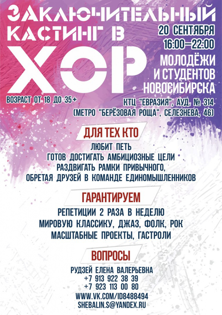 Последний, завершающий кастинг для добора мужчин в хор молодёжи и студенчества состоится 20 сентября. Первые выступления обещают уже в ноябре.