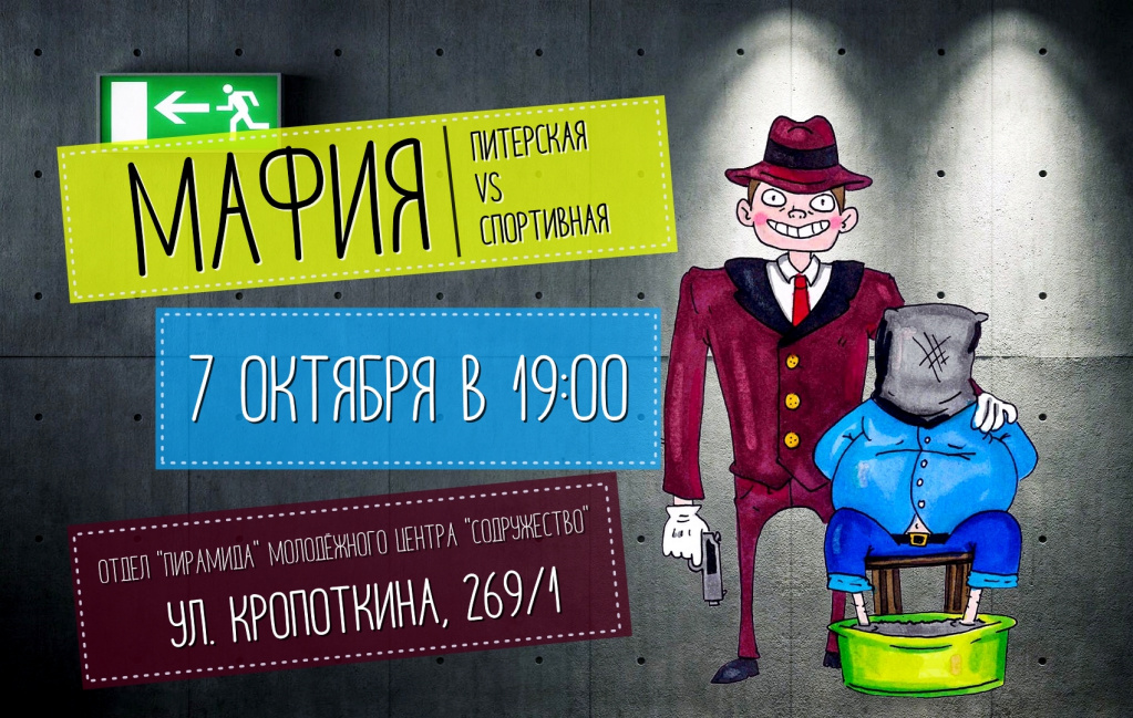 В субботу, 7 октября в отделе «Пирамида» молодёжного центра «Содружество» (ул. Кропоткина, 269/1) пройдёт турнир по игре сразу в две «мафии» – «Питерскую» и «Спортивную».