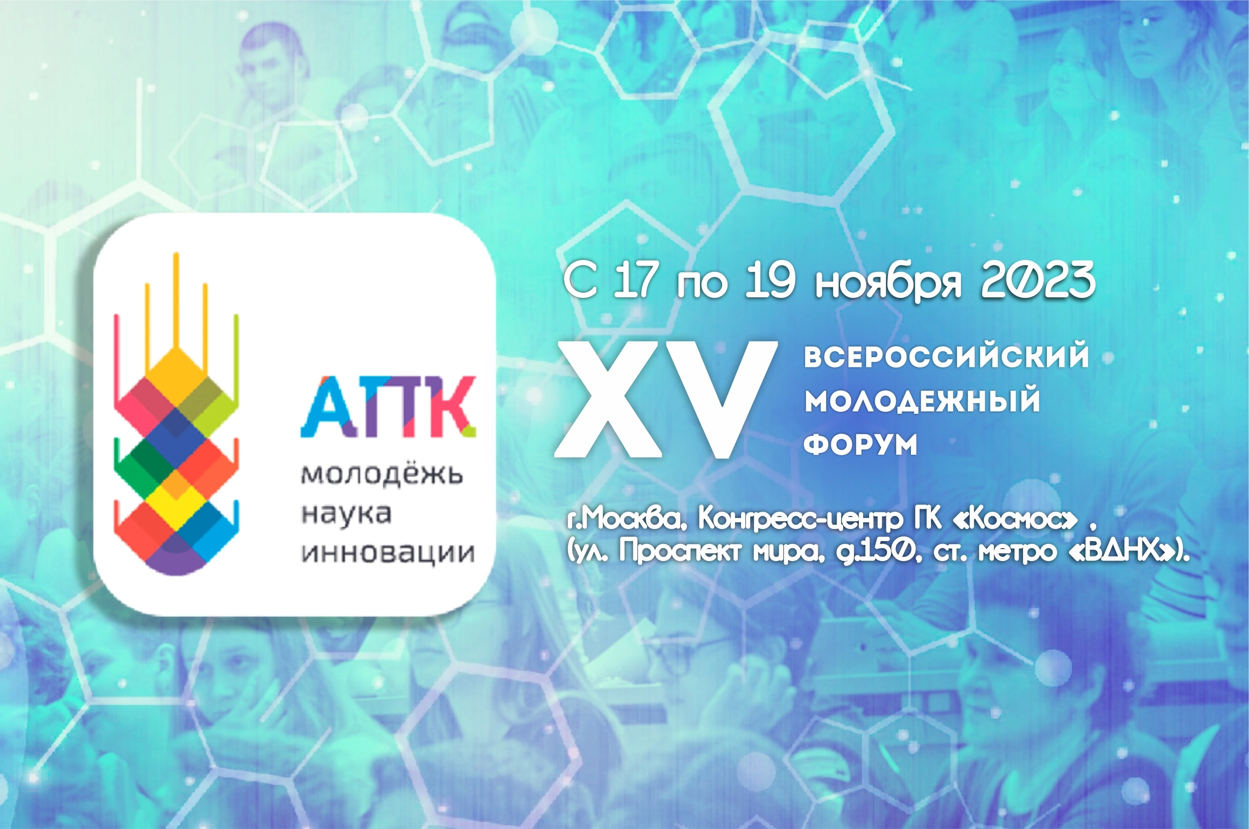 С 17 по 19 ноября 2023 года в Москве в Конгресс-центре ГК «Космос» (Москва, Проспект Мира, д. 150, ст. метро «ВДНХ») состоится ХV Всероссийский молодежный форум «АПК Молодежь, Наука, Инновации».