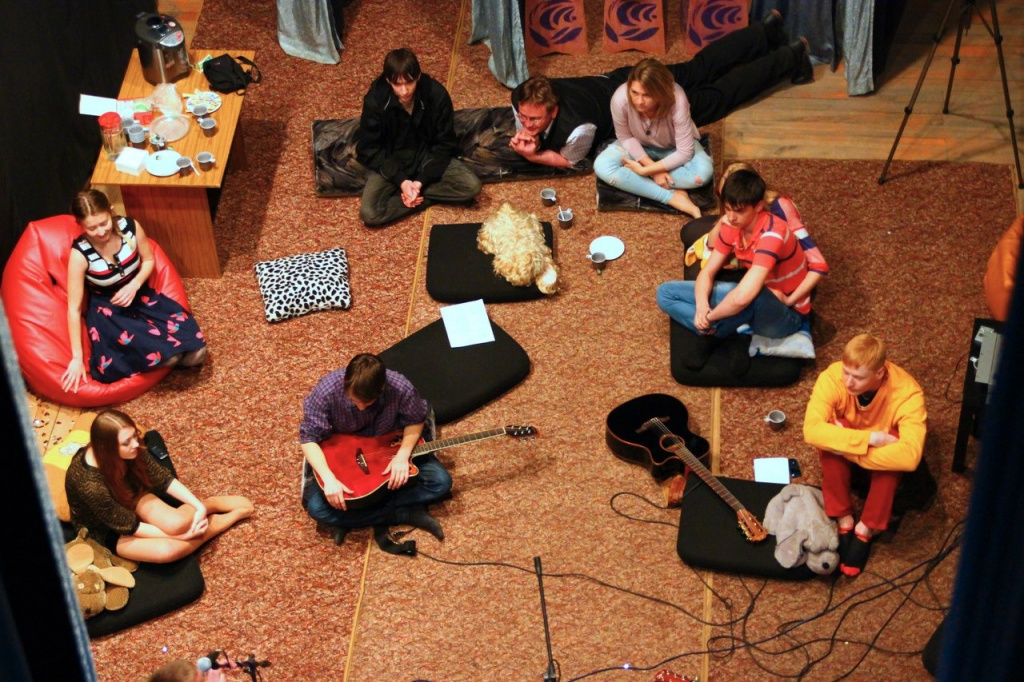 Формат встречи: камерный акустический квартирник. Все действие проходило на сцене Дома молодежи. Но! За закрытым занавесом. На эти несколько часов сцена наполнилась атмосферой квартиры. И не только потому, что вокруг были ковры, подушки, мягкие игрушки, но и благодаря формату общения между участниками: он располагал к свободному диалогу.