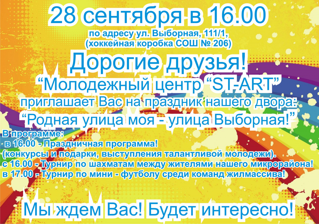 28 сентября в 16:00 состоится концерт-презентация молодёжного центра «Старт» по адресу ул. Выборная 111/1 (хоккейная коробка СОШ № 206).