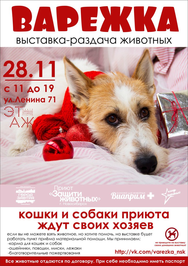 28 ноября с 11:00 до 19:00 в Новосибирске в третий раз пройдет благотворительная акция-раздача бездомных животных «Варежка».