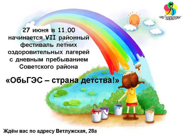 27 июня 2013 года в 11-00 в СП МЦ «Факел» по адресу ул. Ветлужская 28 а состоится VII районный фестиваль летних оздоровительных лагерей с дневным пребыванием Советского района «ОбьГЭС – страна детства!».